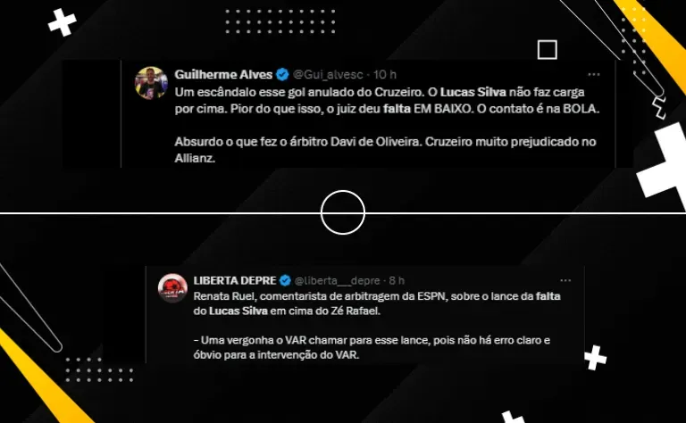 “O Cruzeiro foi prejudicado, todo mundo viu. Acho que é um critério do árbitro, ele não marca nada, absolutamente nada e ele não manteve o critério. E a questão do VAR é clara: questão de interpretação não tem nem que se chamar, só no Brasil que fica chamando o tempo inteiro”, reclamou Mattos.