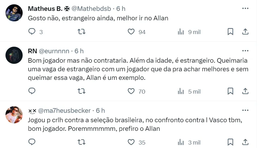 Ainda segundo o repórter Felipe Silva, o Bahia é outro time brasileiro interessado no volante de 35 anos. No entanto, tanto o Vasco como o Tricolor Baiano ainda não formalizaram oferta pelo venezuelano.
