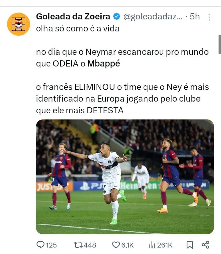 PSG goleou o Barcelona com dois gols do jogador francês. Agora a equipe disputará a semifinal da Champions contra o Borussia dia 30 de abril