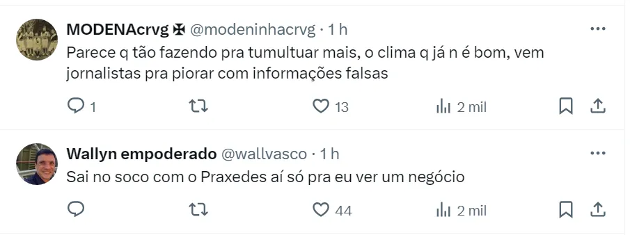 “Discussão de fato foi apenas a de Medel com Alexandre Mattos, em uma reunião, que também não passou da esfera verbal. Nada além”, escreveu o perfil vascaíno. Após essa história ganhar repercussão nas redes sociais, os jogadores também responderam.