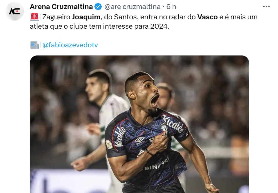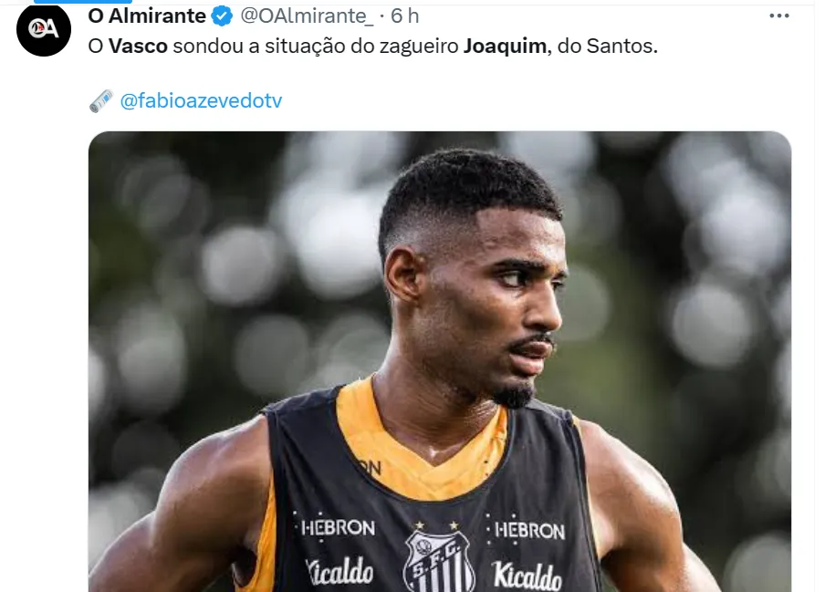 O jornalista Fábio Azevedo, do canal Fanático Vascaíno, que cobre o Vasco, informou que Joaquim, do rebaixado Santos, interessa a Ramón Díaz e sua comissão técnica em São Januário. O jogador pode deixar o Santos em ano de Série B.