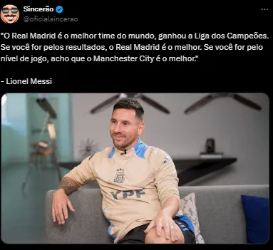 O argentino também falou sobre a possibilidade de Neymar acertar com o Inter Miami. “Não sei. A verdade é que agora é difícil. Ele está na Arábia e me parece que lhe resta um ano de contrato”, analisou.