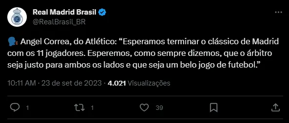 Do outro lado, no entanto, uma fala do atacante Ángel Correa causou polêmica às vésperas do clássico da capital espanhola. Isso porque o atleta disse que espera que a partida termine com os 11 jogadores, sugerindo que o Real Madrid possa ser favorecido pela arbitragem. “Esperamos terminar o clássico de Madrid com os 11 jogadores. Esperemos, como sempre dizemos, que o árbitro seja justo para ambos os lados e que seja um belo jogo de futebol“, disse o atacante.