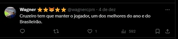 “Meu foco está no Cruzeiro, tenho contrato até o ano que vem. Não depende só de mim, espero que a gente sente, converse e ache um bom termo para os dois lados“, comentou após o jogo diante do Botafogo, pela 37ª rodada.