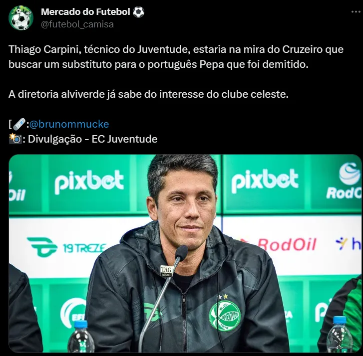 O paulista de 37 anos é um dos comandantes mais promissores do Brasil e os fanáticos da Raposa estão observando o seu perfil. “Thiago Carpini é o nome pra salvar o cabuloso”, “Se fosse o Cruzeiro, apostaria nele. Vêm de bons trabalhos” e “É uma das melhores opções se o Cruzeiro realmente quiser trazer um treinador brasileiro dessa vez. Faz mágica no Juventude e espera uma chance como essa pra se firmar”.