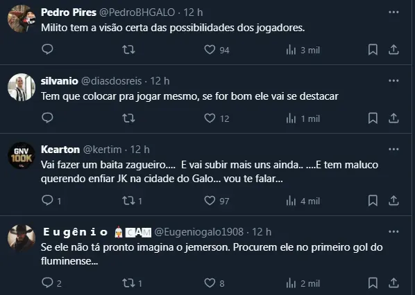 “É um jogador muito potente e jovem. Tem que melhorar em alguns aspectos, mas me dá confiança. Jemerson tinha amarelo. Não queria jogar o segundo tempo, contra jogadores velozes, com o Jemerson pendurado. Escolhi Rômulo porque joga naturalmente pela esquerda, é veloz, tem potência e minha confiança”, disse à Galo TV.