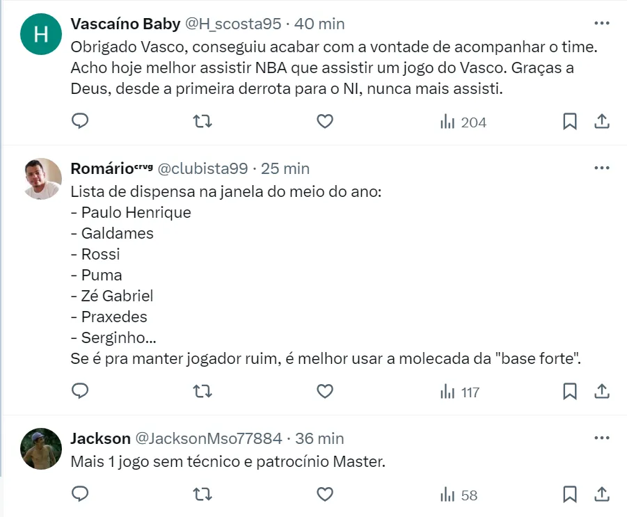 “Pelo andar da carruagem, existem apenas três vagar para a Série B 2025. Pois uma parece já ser do monumental Vasco da Gama, de pífios resultados neste pontapé inicial do Brasileirão”, disse o comunicador em sua coluna no UOL Esporte.