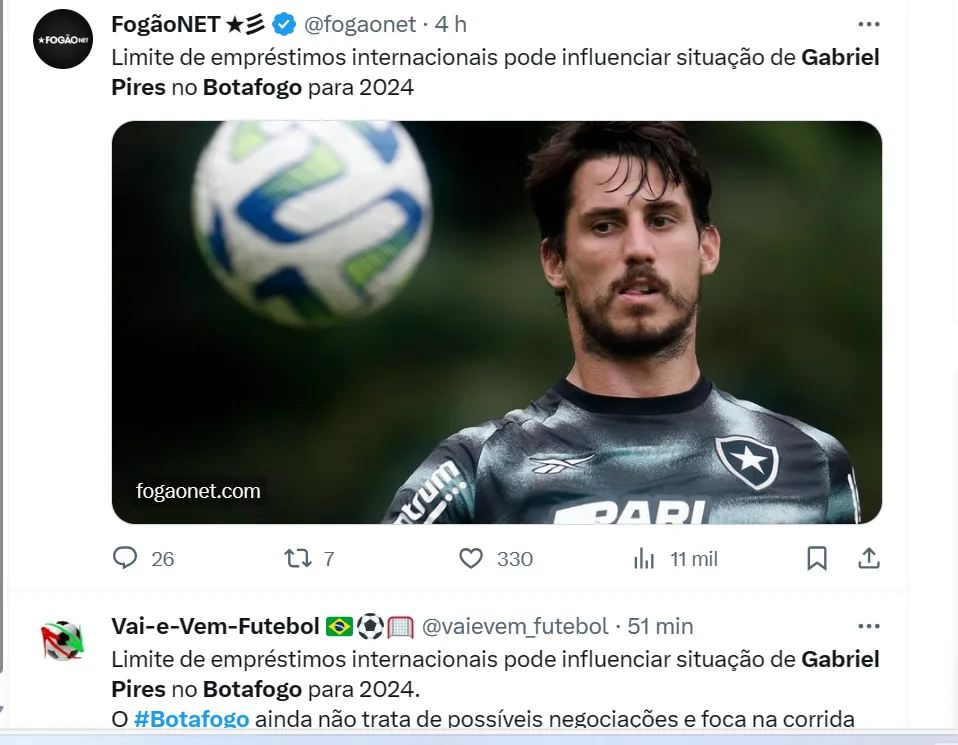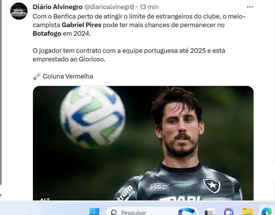 Nos bastidores, a diretoria também cuida de pendências em relação ao elenco. Uma delas é Gabriel Pires, emprestado pelo Benfica até dezembro. Em setembro, o jornal A Bola, de Portugal, noticiou que o Botafogo preparava a compra do meia de 30 anos. Agora, todavia, a situação mudou drasticamente.