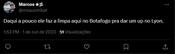 “Muita gente aqui do Botafogo vai acordar do nada na França ano que vem”, “Daqui a pouco ele faz a limpa aqui no Botafogo pra dar um up no Lyon”, “Vai levar metade do Botafogo” e “Nem um pouco preocupado com eles. Sou Botafogo, o único problema é eles levarem nossos melhores jogadores a preço de banana”, foram alguns dos comentários da torcida do Botafogo.