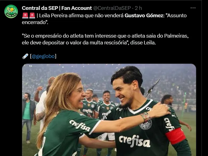 Mesmo com tanto dinheiro na mesa, a presidente Leila Pereira já deu a resposta e ditou qual será o tom das conversas daqui em diante: “O Palmeiras não negociará o atleta Gustavo Gómez. Estamos focados na Libertadores e no Brasileirão. Este assunto está encerrado. Eu quem assino a venda de atletas e eu asseguro, Gustavo Gomez não será vendido”, enfatiza.