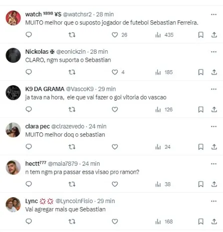 (SIC) “Coloca o mlk pra jogar ao lado do Vegetti, pior que o Sebastian eu garanto que não vai ser”, disse um torcedor, com outro seguindo a mesma linha: “Rayan não é banco pro Sebastian e nem pro Serginho nunca”, publicou.