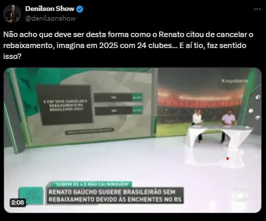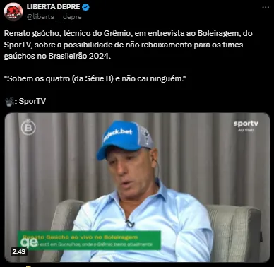Com todos os problemas provenientes das enchentes no Rio Grande do Sul, o técnico Renato Portaluppi, do Grêmio, falou sobre a possibilidade do Brasileirão 2024 não ter nenhum time rebaixado.