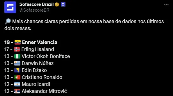 O atacante figura no topo da lista do aplicativo e site SofaScore como o jogador que mais desperdiça oportunidades de gol no mundo, abandonando nomes como Haaland e Cristiano Ronaldo.