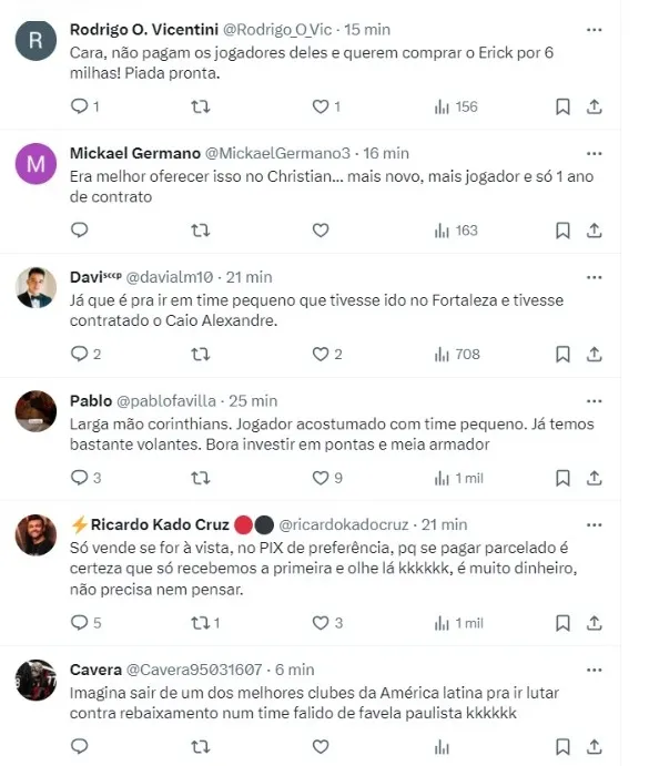 “Cara, não pagam os jogadores deles e querem comprar o Erick por 6 milhas! Piada pronta“, escreveu um torcedor. “Só vende se for à vista, no PIX de preferência, pq se pagar parcelado é certeza que só recebemos a primeira e olhe lá“, completou outro torcedor.