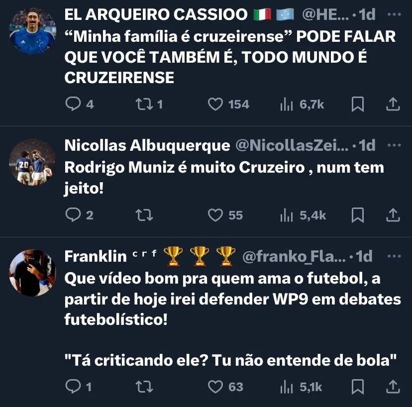 O atleta também conta que ficava impressionado vendo o ex-cruzeirense com a camisa Celeste: “Eu ficava: ‘Caraca, o Wellington Paulista, que cara top”. Até que em 2021 o enfrentou em uma partida do Flamengo contra o Fortaleza: