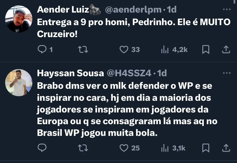 “Para começar, todo mundo que falou ‘por que o Wellington?’ não acompanhou a carreira dele. Não acompanhou o jogador que ele foi. Me lembro que eu gostava muito dos atacantes e ele fazia muito gol. Na época que estava no Cruzeiro, ele era um absurdo”, conta o atacante.