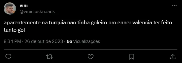 “Aparentemente na Turquia nao tinha goleiro pro Enner Valencia ter feito tanto gol”, “Se o Enner fizesse 50% das chances que tem o Alan Patrick era o jogador com mais passes para gol no futebol mundial”, “Enner Valencia é tipo o Gabigol na melhor fase , metia 1 gol e perdia 2″ e Boa Enner Valencia, perde mais gols de novo”, foram alguns dos comentários.