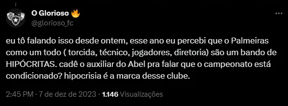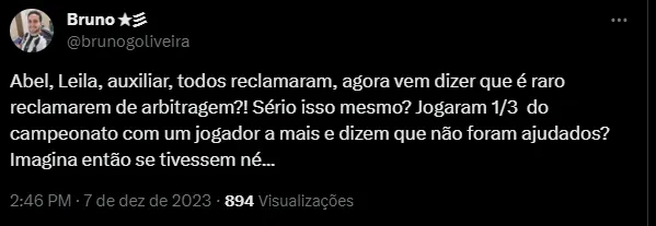 “O Palmeiras foi campeão de forma digna, sem ajuda, porque trabalhou e foi competente. Tudo que vem fora disso é desculpa de quem não teve capacidade. É raro ver o Palmeiras reclamar de arbitragem”, finalizou.