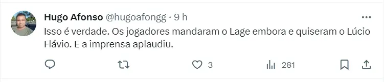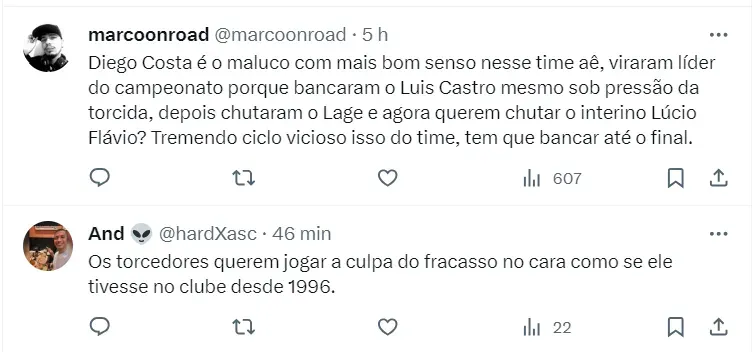 Diante disso, a pressão para a saída do técnico Lúcio Flávio está muito grande nos bastidores. Vale destacar que a escolha do comandante para o cargo foi um pedido do elenco após a saída do técnico Bruno Lage. Assim como, a colocação de Joel Carli como auxiliar técnico da equipe.