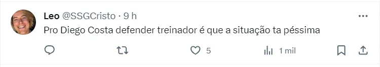 Diego Costa ainda saiu em defesa do treinador, apontando que a situação do Botafogo vai muito além da comissão técnica. “Não vamos botar a culpa no Lúcio Flávio. Ele está aí para nos ajudar, é um ídolo do clube e não tem culpa nenhuma nisso”.