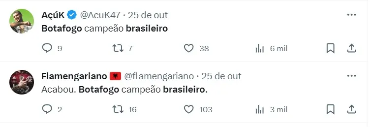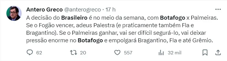 “O Palmeiras que tem três anos de Abel Ferreira. O Abel Ferreira, se ganhar o jogo quarta-feira, eu acho que dificilmente o Palmeiras perde o título pro Botafogo. O Botafogo pode entregar o título pro Palmeiras, não tenha dúvida disso”, destacou.