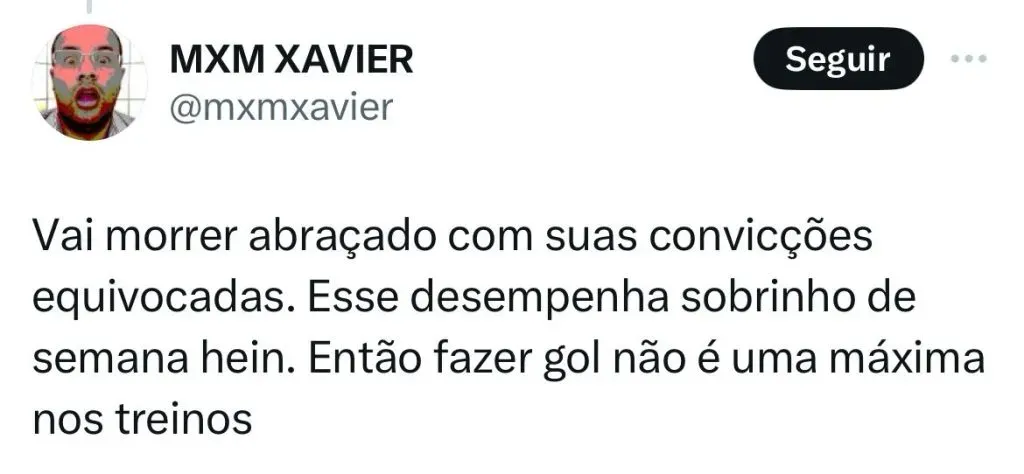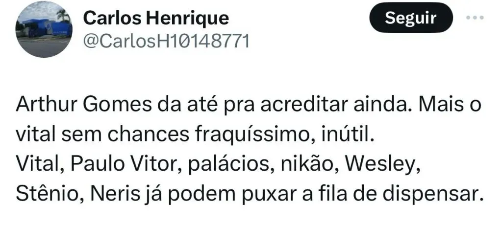 “Não é insistência, é entrega daquilo que acontece durante a semana. O Arthur fez um desempenho tático que ajudou muito a equipe a marcar a saída de três do São Paulo”, disse o treinador que na sequência falou sobre Mateus Vital.