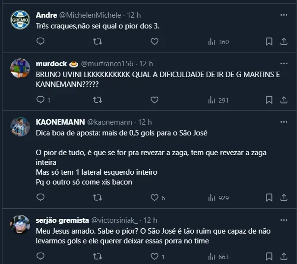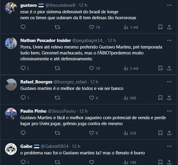 Por fim, com a informação de que Gustavo Martins ficará no banco de reservas, diversos gremistas foram às redes sociais e criticaram as mudanças de Renato, principalmente por Fábio e Bruno Uvini entrarem na equipe.