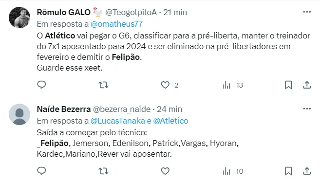 O técnico, por sua vez, parou na porta do ônibus do Atlético e parecia tentar entender o que acontecia no local. Ao mesmo tempo, seguranças do clube se dirigiram ao grupo e pediram que cessassem as ofensas ao gaúcho de 74 anos.