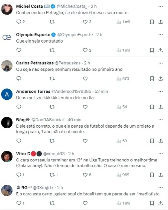 A negociação entre Athletico e Domenec Torrent se arrasta. O clube oferece 1 ano de contrato, mas o treinador quer 2. O entendimento de Dome é de que apenas uma temporada é pouco tempo para colocar um projeto para rodar“, escreveu Raíssa.