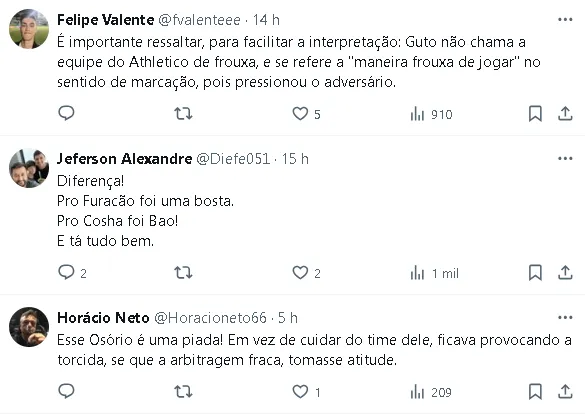 Por outro lado, Guto Ferreira enxergou a partida de maneira positiva, destacando a proposta e a atuação de sua equipe durante o confronto. O comandante do Coritiba ressaltou a postura de sua equipe, que dificultou ao máximo o jogo do adversário, impedindo que o Athletico impusesse seu estilo de jogo habitual.
