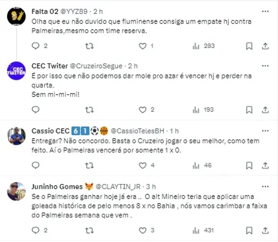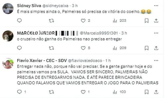 Para não ver a “possibilidade” do Atlético-MG se sagrar campeão, os torcedores cruzeirenses têm pedido na web que a equipe vença o seu confronto contra o Botafogo e “entregue” o jogo para o Palmeiras.