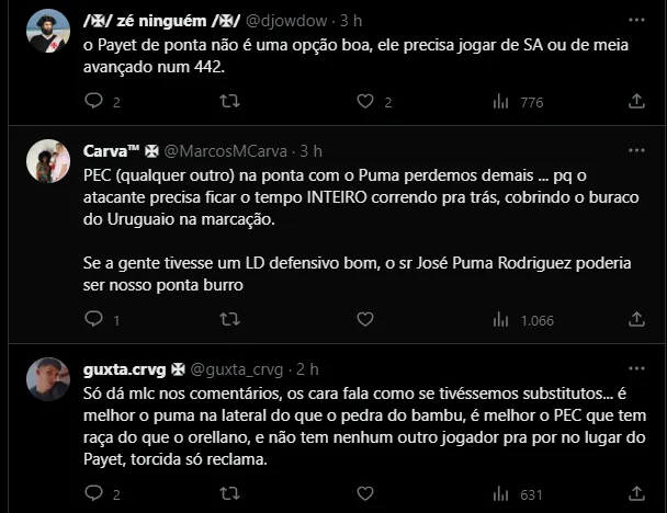 Assim, de acordo com informações do GE, a expectativa é que Gabriel Pec recupere seu lugar no time titular e seja o substituto. A cria da Colina é um dos artilheiros do time no ano e vem colaborando toda a vez que entra. Até por isso, após seu nome ser anunciado como provável substituto de Rossi, torcedores do Vasco foram até as redes sociais manifestar a sua opinião e o tema dividiu a torcida, sobrando até para o Payet. Confira:
