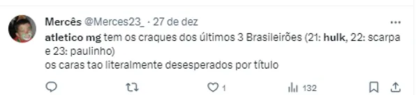 Essa ideia de trazer poucas peças, passa, principalmente, para manter o elenco titular para a temporada de 2024. O Galo pretende passar ileso na janela de transferências.