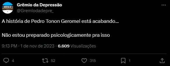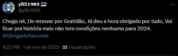 “A história de Pedro Tonon Geromel está acabando… Não estou preparado psicologicamente pra isso”, “Galera, eu sei que dói pensar nisso, mas assim, deu de Geromel, né!?” e “Por mais que queiramos, acabou. Infelizmente tá na hora de pensar em substituição”, foram alguns dos comentários.