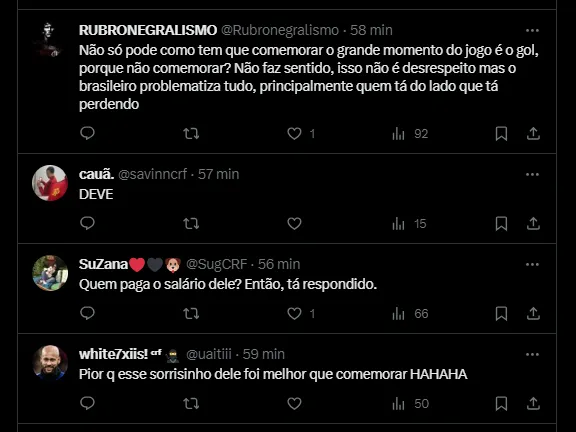 Responsável por abrir o placar no confronto antes de Ferreira, Nathan Henrique e André virarem o jogo, Everton Cebolinha decidiu não comemorar e dividiu a torcida do Rubro-Negro. Para muitos torcedores, ele deveria ter comemorado, sim, visto que quem paga o salário dele é a equipe da Gávea.