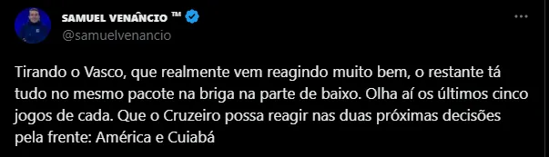 “Sabemos que são dois jogos em casa, contra grandes equipes, Fluminense e Cruzeiro, depois tem um jogo fora contra o Coritiba, também. Espero que a gente possa, nesses três jogos, fazer nove pontos e dar alegria para o nosso torcedor“, disse na saída da Arena MRV. Vale ressaltar que o Cuiabá venceu o Cruzeiro no primeiro turno, em partida disputada na Arena do Jacaré. O Cabuloso ainda terá o América-MG pela frente antes de encarar o Dourado.