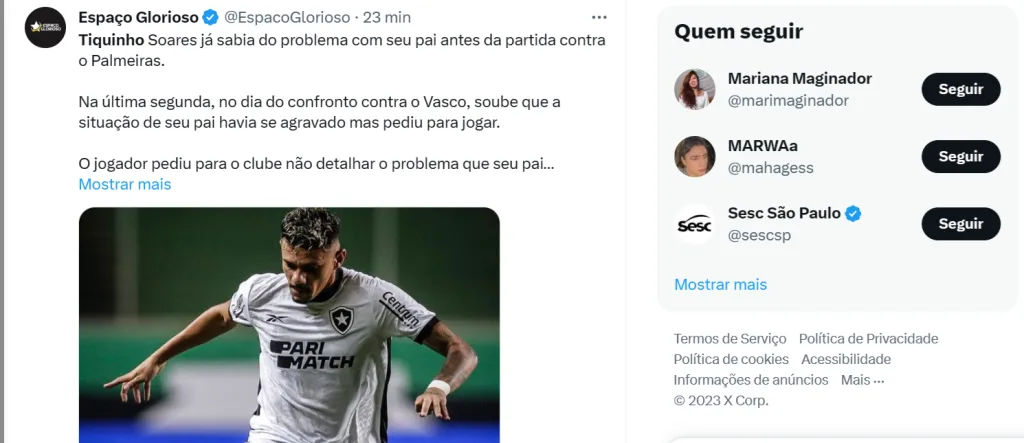 Tiquinho prefere que o problema não seja detalhado e nem comentado pelo Botafogo. Antes do clássico contra o Vasco, o centroavante preferiu seguir relacionado para a partida mesmo com a situação agravada.