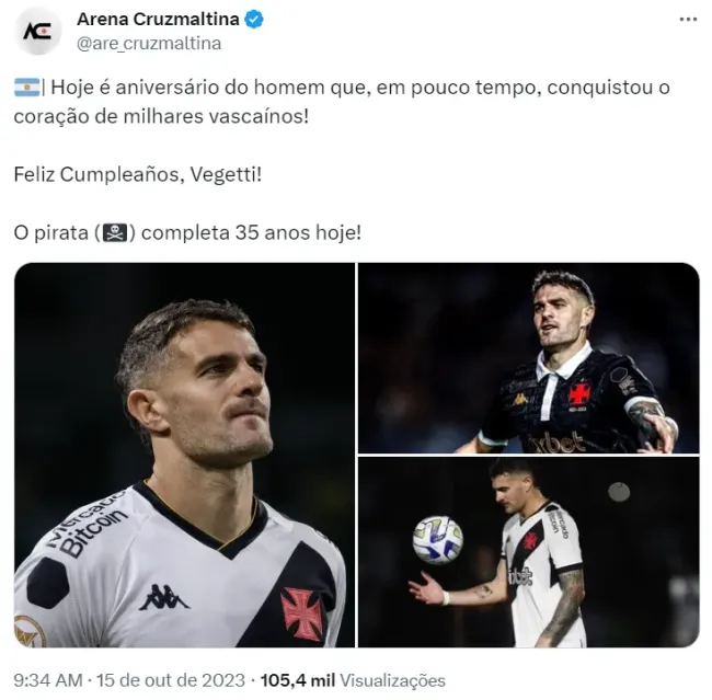 Contratado pelo Cruz-maltino em agosto, como mais um reforço para o elenco do treinador Ramón Díaz, Vegetti tem contrato com o Vasco até julho de 2024. Aos 35 anos, o atacante argentino construiu sua carreira em clubes de sua terra natal. Em seu último clube, o Belgrano-ARG, anotou 13 gols pela Primera División Argentina, sendo ainda hoje o artilheiro da competição em 2023.