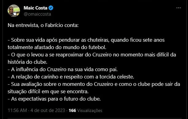 No momento, a Raposa soma 30 pontos e está quatro acima do Vasco, 17° colocado. Até por isso, em entrevista ao portal Trivela, o ex-volante Fabrício, ídolo e torcedor assumido do Cabuloso, foi questionado em entrevista sobre o que ele pensa do momento atual da equipe. Vale destacar que foram quatro anos vestindo a camisa do Zeiro, com o vice da Libertadores de 2009 no currículo.