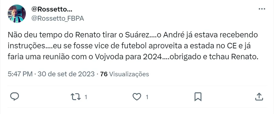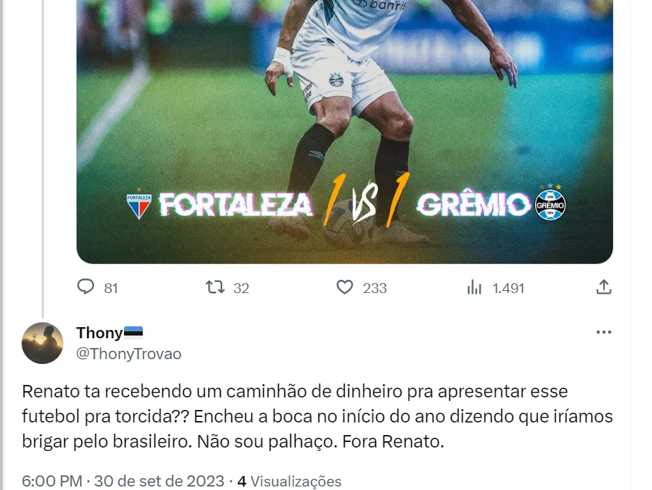 “Por favor, não renovem com Renato para o ano que vem”, afirmou um torcedor do Grêmio. “Ano que vem precisamos de um técnico. Sem brasileiros. Não importa de onde venha, mas precisamos de um treinador urgente. Renato com o elenco do Flamengo não fez nada. Grêmio não pode viver de passado ou ficaremos nessa mesma rotina de tomar pressão do time reserva de Fortaleza”, disse outro gremista no Twitter.
