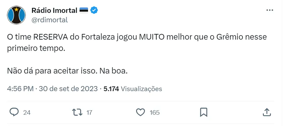O Fortaleza escalou um time reserva em função do jogo decisivo da próxima terça-feira (3), contra o Corinthians, pela Copa Sul-Americana, mas mesmo assim foi superior ao Imortal no primeiro tempo e abriu o placar com o atacante Thiago Galhardo, em cobrança de pênalti. Nas redes sociais, os torcedores gremistas ficaram na bronca com o treinador Renato Portaluppi e acharam inaceitável a postura da equipe.