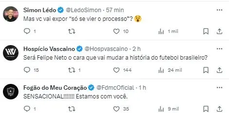 “Poucas vezes recebi tanto apoio. Até galera de extrema direita falando ‘tem que ir pra cima da CBF mesmo’. Olha o que os caras tão conseguindo…”, revelou Felipe Neto, em postagem realizada em sua rede social.