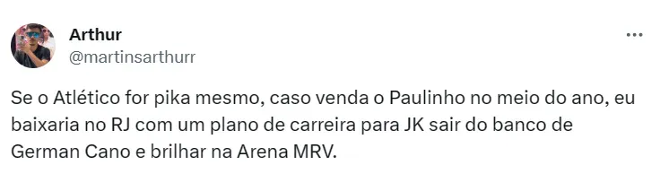 “Acho que ninguém (está preparado para perder Paulinho). O que eu posso afirmar é que nós não tivemos nenhuma proposta nesse momento. A gente sabe que a janela europeia de janeiro não é a mais favorável para transações. Agora, te falar que lá no meio do próximo ano, se vier uma proposta irrecusável, dessa forma que a gente tem que tratar, porque é um jogador de altíssimo nível, jovem, seleção brasileira e artilheiro do Campeonato Brasileiro”, explicou Caetano.