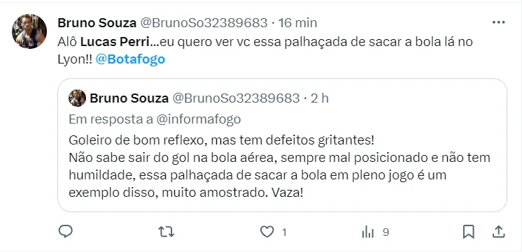 Perri ainda destacou sobre a cobrança da torcida diante do momento da equipe. “Quando os resultados não vêm da forma que queríamos, é natural, temos que ser cobrados e vaiados. Não posso controlar o que a torcida vai achar de mim. Da minha parte, só gratidão e orgulho de ter representado o Botafogo”, completou.