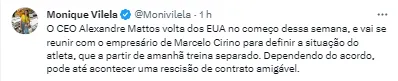 Com toda situação, o CEO Alexandre Mattos vai se reunir com o empresário de Cirino no começo dessa semana para definir a situação do atleta que a partir desta segunda-feira (18) treina separado do elenco. Dependendo do acordo, pode até acontecer uma rescisão de contrato amigável, ainda segundo informações da jornalista.