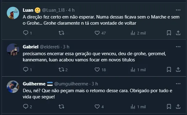 Por fim, sem Marcelo Grohe, o Grêmio segue buscando reforços no mercado e o principal alvo segue sendo um camisa 9. Atualmente, nenhum acerto está próximo e a torcida está frustrada.