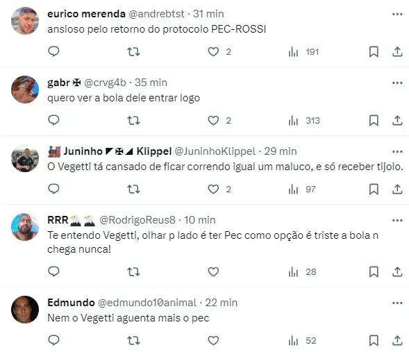 Em entrevista coletiva nesta quinta-feira (9), à VascoTV, Rossi afirmou estar ansioso para o seu retorno: “Não vejo a hora de voltar a jogar com o Vegetti. Todo dia ele pergunta como estou. Estou ansioso para voltar e dar assistências para ele fazer gols”, disse o atleta vascaíno sobre o seu retorno.