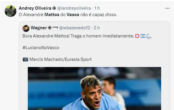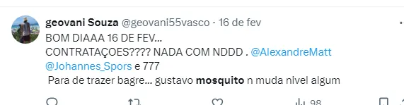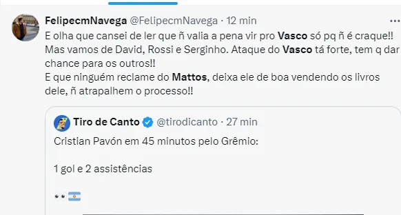 Já no mercado da bola, o dirigente vascaíno descartou a contratação de Gustavo Mosquito, do Corinthians. Jorge Nicola informou neste sábado (17) que o Cruz-Maltino não tem interesse no jogador de 26 anos.