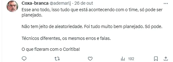 “Sobre minha permanência ou não, eu estou tranquilo. A minha maior preocupação é fazer que o Coritiba tenha os resultados que o interessa. Se amanhã ou depois eu tiver que sair, será de cabeça erguida, sei que tentei fazer o meu melhor. Tenho certeza que o clube está vendo o trabalho. Fico tranquilo”.