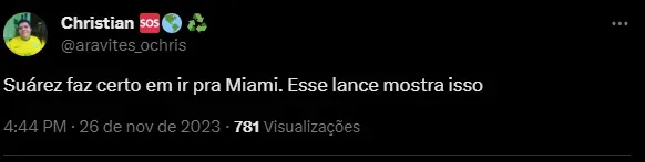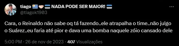 “Suárez faz certo em ir pra Miami. Esse lance mostra isso”, “Cara, o Reinaldo não sabe oq tá fazendo..ele atrapalha o time..não julgo o Suárez..eu faria até pior e dava uma bomba naquele zóio cansado dele”